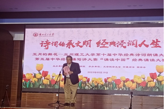特邀嘉宾原甘肃省教育厅副巡视员丁光明老师对本次比赛进行点评,他对“五月的鲜花”十年的持之以恒给予了充分肯定,并以《将进酒》为参赛选手作了示范朗诵,其朗诵气运激昂慷慨,情感忽翕忽张,热情豪放的诗仙李白形象在他雄浑轩昂的声音中赫然屹立。
