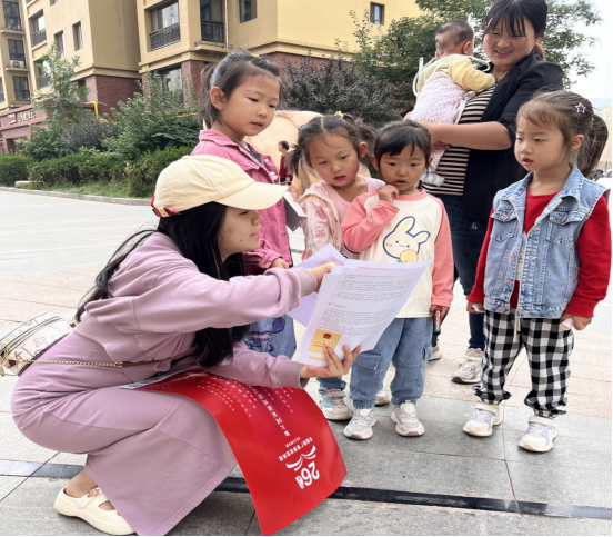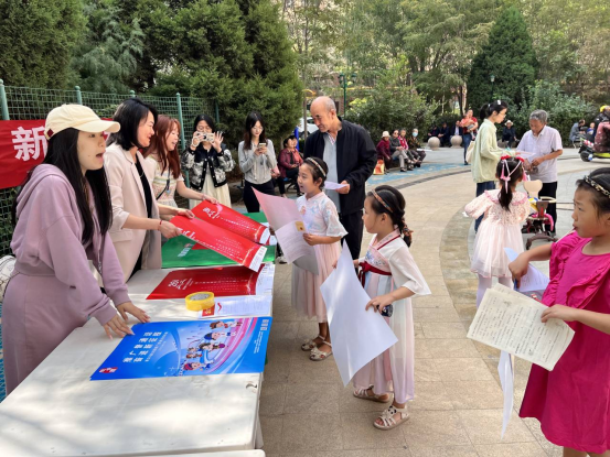 员工志愿者向小区居民发放普通话宣传资料,同时讲解普通话的意义,并采用互动方式为居民就普通话常见的发音问题进行了正确示范,并针对未成年人,告诉他们什么是普通话、为什么要推广普通话、怎么说好普通话,引导居民树立正确的语言观,使居民在日常生活中养成说普通话的习惯。