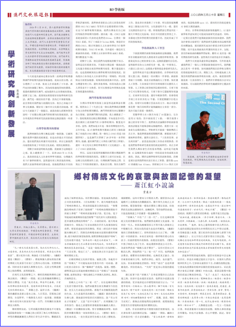 来源:《澳门文化旅游报》(2024年第14期B3学术版),转自《澳门文化旅游报》官方公众号https://mp.weixin.qq.com/s/snbp_SrrsEzftXd5RGb-7A[学术]鄉村傳統文化的哀歌與故園記憶的凝望——蕭江虹小說論