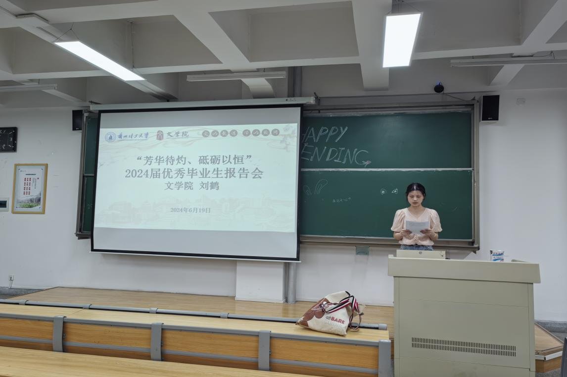 为充分发挥优秀毕业生的典型示范引领作用,引导低年级员工做好学业规划,营造良好学习氛围,伟德体育于2024年6月19日下午在彭家坪校区观成楼205室举办了“芳华待灼、砥砺以恒”2024届优秀毕业生报告会,邀请2024届优秀毕业生代表刘鹤同学为伟德体育本科生同学做分享报告,汉语言文学专业23至21级本科生参加,报告会由院员工会主席王治凯主持,