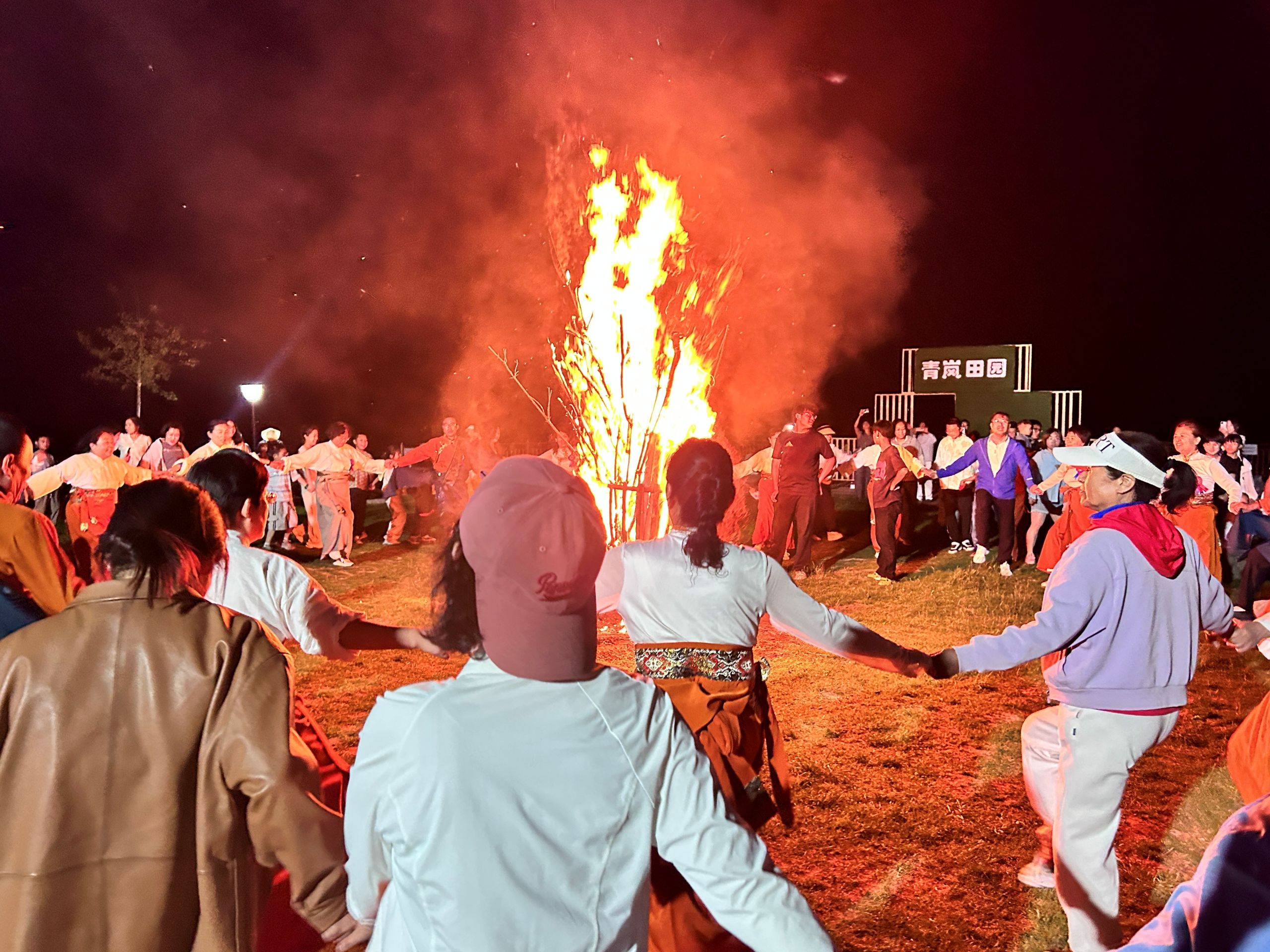 四百余名参与者围着熊熊燃烧的篝火跳锅庄舞
