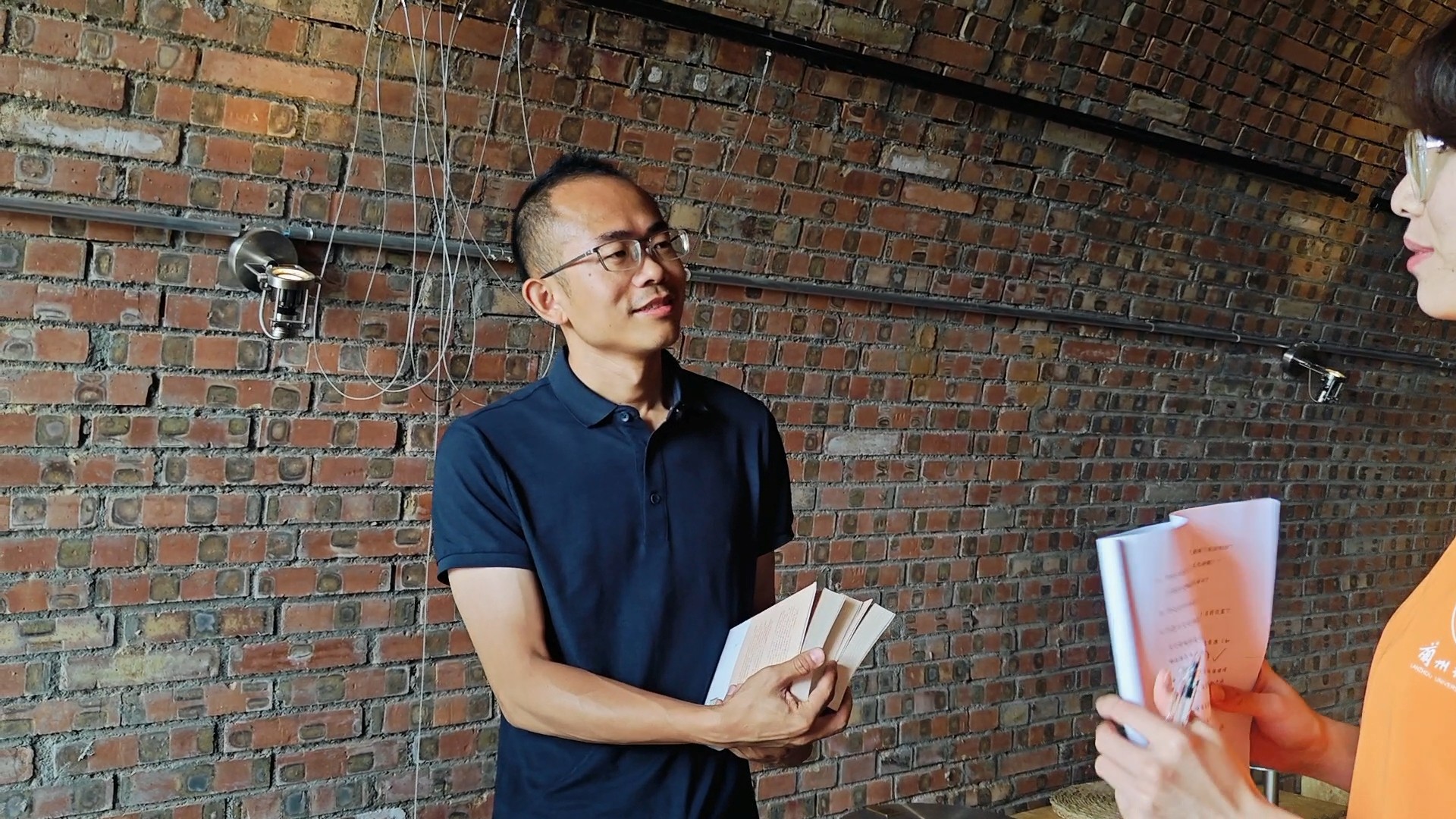 社会实践团队组长鲁思雨(右)采访邹佳俊窑(左)见咖啡馆整体建筑设计理念