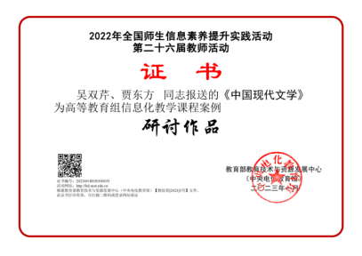 近日,教育部教育技术与资源发展中心颁发了“2022 年全国师生信息素养提升实践活动(第二十六届教师活动)”的荣誉证书。伟德体育报送的本科生课程《中国现代文学》获得高等教育信息化教学课程“研讨作品”称号。